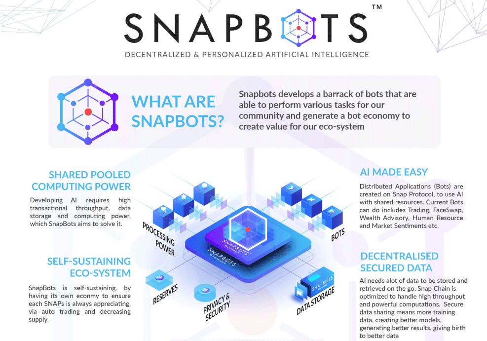 SnapBots creates bots to perform revenue earning tasks which help build up a pool of cryptocurrencies. This pool is used to back the supply of SNAP tokens and will boost their value as the size of the pool increases. SNAP tokens are utilised by the SnapBots community to pay for the usage of the bots. These used tokens are then burnt, increasing the value of remaining tokens. SnapBots envisages, and rewards a large community to allow crowd sourcing of intelligent bots. Whenever Snap Researchers build a bot on our ecosystem, they know they are able to draw from the expertise of Snap Experts within the community.